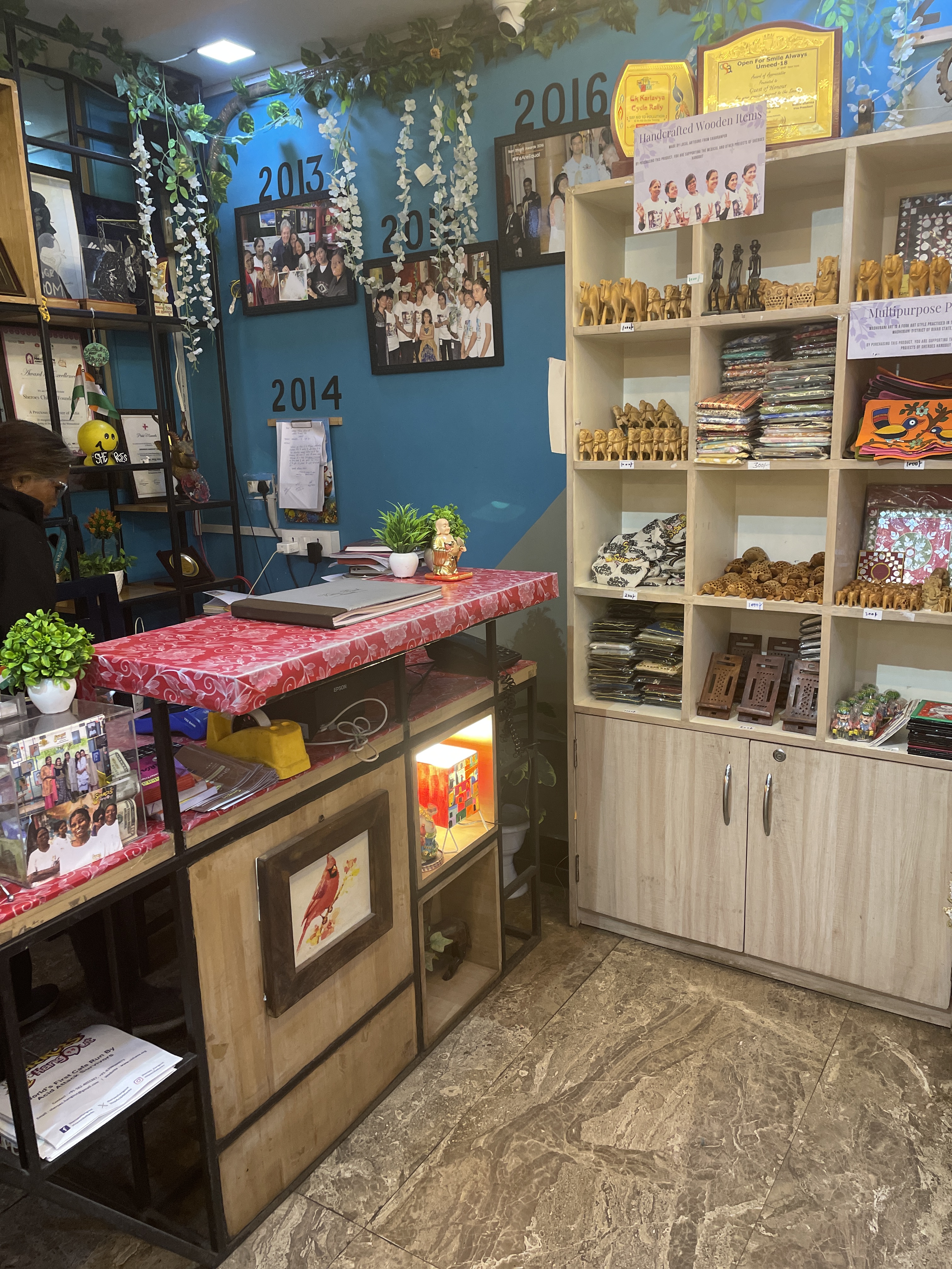 Sheroes is a café with excellent food and atmosphere. Despite challenges, including financial crises during the pandemic, the café continues to thrive, supported by donations and the determination of its staff. You can order delicious food, get henna done on your hands and buy some beautiful articles such as pouches, bags, notebooks, pashminas and lovely handmade jewellery.